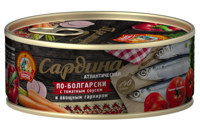 Состав: рыба, томатный соус (паста томатная, сахар, масло подсолнечное рафинированное дезодорированное, соль, мука пшеничная, лук, регулятор кислотности — уксусная кислота ледяная (Е260), экстракт пряностей (перец душистый, перец черный, гвоздика, кориандр, лавровый лист), гарнир (морковь, лук)