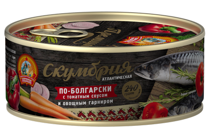 Состав: рыба, томатный соус (паста томатная, сахар, масло подсолнечное рафинированное дезодорированное, соль, мука пшеничная, лук, регулятор кислотности — уксусная кислота ледяная (Е260), экстракт пряностей (перец душистый, перец черный, гвоздика, кориандр, лавровый лист), гарнир (морковь, лук)